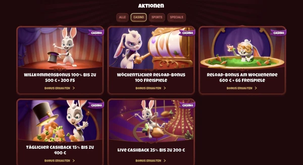 Unsere Bonusseite ist in einfache Kategorien gegliedert: ein Casino-Ersteinzahlungs-Paket, wöchentliche Angebote, Turniere, Sport-Promos und langfristige Rewards über VIP und Coins. Wir zeigen die wichtigsten Kennzahlen klar, damit Spieler Aufwand, Wert und Umsatzbedingungen vergleichen können, bevor sie teilnehmen.