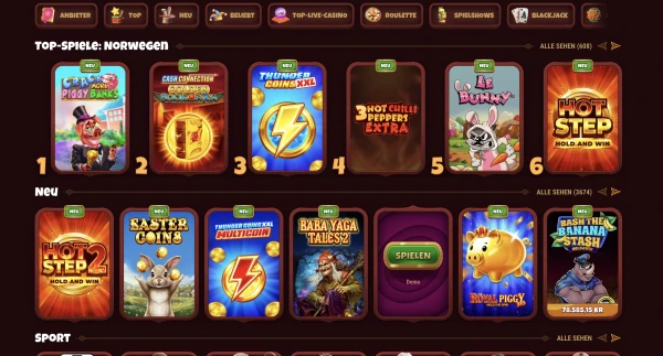 Beliebte und trendige Picks in unserer Lobby sind Gates of Olympus von Pragmatic Play, Book of Dead von Play’n GO, Starburst von NetEnt, Mega Moolah von Microgaming, Fire in the Hole von Nolimit City, Gonzo’s Quest von NetEnt, Sweet Bonanza von Pragmatic Play und Age of the Gods von Playtech. Im Live-Bereich starten viele Nutzer mit Lightning Roulette von Evolution, Live-Blackjack-Tischen, Baccarat und Game-Show-Titeln. Diese Spiele decken High-Volatility-Slots, Jackpot-Play, klassische Tischspiele und Sessions mit echten Dealern ab.